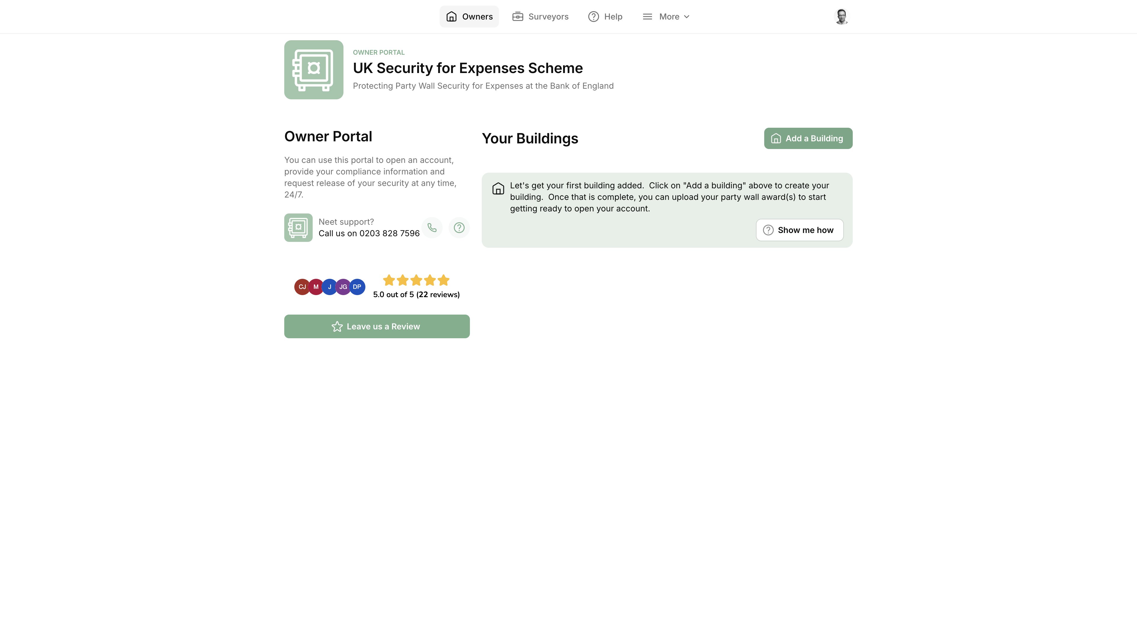 Creating a building on the UK Security for Expenses Scheme Portal.